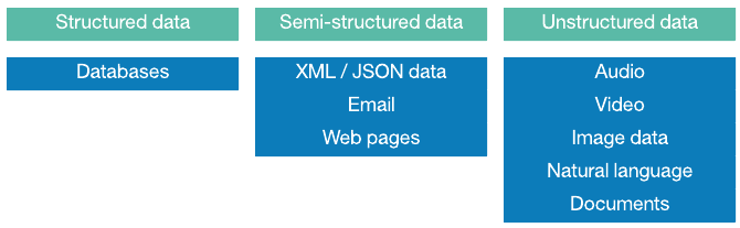 Tidak semua data terstruktur atau bahkan semi terstruktur. Misalnya, dokumen, gambar, audio, data audio dan video, serta file biner mungkin tidak memiliki struktur khusus. Data semacam ini disebut sebagai data tak terstruktur.